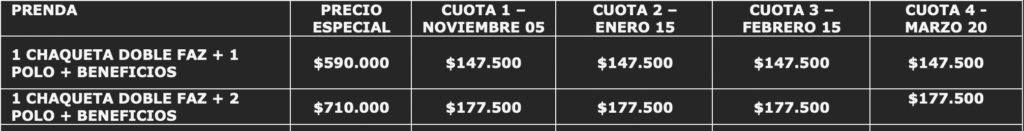 CIRCULARIO DIANA OESE PROM 2027 CIRCULARIO DIANA OESE PROM 2027ΔFORMULARIO DIANA OESE PROM 2027Pronto llegará el momento de mostrarle al mundo quién manda para la PROM 2027. Por favor diligencia este formulario completamente en las próximas 24 horas. Por favor consulta con tus padres tu elección.Para iniciar el proceso se requieren 3 condiciones: 1) Diseño aprobado. 2) Que todos los estudiantes diligencien el formulario de tallas y nicknames. 3) Abono inicial de todos los interesados. Cantidad mínima 45. Estos precios no incluyen costos adicionales de emojis y parches. (esos costos estarán cada sección del formulario y se sumarán en el precio final de cada estudiante).Selecciona tu nombre de la lista– Select –Abello Obando, ValeriaAlonso Cardozo, SofiaBolaños Villaci, SamuelCaballero Cerquera, Laura SofiaCandotti Osorio, ValentinoCastro Chala, MartinChamorro Caicedo, Karol MarcelaChaves Bedoya, David SantiagoDavila Arias, Juan JoseGutierrez Ramos, Juan JacoboHernandez Cifuentes, DanielHernandez Echandia, Maria JoseHerrera Salas, TomasHoyos Garcia, IsabellaLara Ante, Juan EstebanLozada Jaramillo, SaraMarin Tangarife, SalomeMejia Arango, Maria CamilaMolina Chitiva, ValeriaMontoya Gutierrez, Maria PaulaMorante Barragan, Jose AlejandroMunoz Polanco, Maria PaulaNarvaez Ramos, Laura SofiaNunez Garcia, SebastianOcampo Perea, SamuelOspina Ceron, SaraOviedo Landazabal, SamuelParra Zora, SalomePazmino Padilla, RebeccaPolanco Munoz, SantiagoPosada Velasco, Ana SofiaPoveda SebastianPrado Gonzalez, ThomasRamos Semanate, Julian SamuelRevelo Pacheco, SofiaRios Tabares, SamuelRivas Chavarro, Maria JoseRodriguez Castillo, Daniel FelipeRomero Meza, SamuelRomero Salcedo, Juan AndresRomero Tamayo, Dara sofiaTorres Cote, GabrielaTorres Gonzalez, AlejandroTrujillo SofiaUribe Laserna, Pedro JoseValencia Gomez, Juan DiegoVarela Astudillo, IsaacVillamarin Quiroz, SamuelORANGECorreo electrónicoNumero de Celular o WhatsappGénero Hombre MujerSelecciona las prendas en las que estás interesado Chaqueta doble faz PoloNOMBRES PERSONALIZADOSEn esta sección harás tu pedido y pondrás los nombres personalizados. Puedes agregar emojis personalizados al lado del nombre por 10.000 c/u. Este es el listado de los emojis disponibles: ESCRIBE EL NOMBRE QUE QUIERES EN TU CHAQUETAESCRIBE EL NÚMERO DEL EMOJIESCRIBE EL NOMBRE DE TU CHAQUETA LADO B – INFORMALESCRIBE EL NÚMERO DEL EMOJIPARCHES PERSONALIZADOS ($35.000)En esta sección podrás incluir parches personalizados si así lo quieres.Pueden agregar hasta 3 parches en tu manga derecha Aquí podrán mirar los parches disponibles:CATALOGO DE PARCHES ORANGE (2)#NÚMERO DEL PARCHE 1 (hombro)#NÚMERO DEL PARCHE 2 (codo)#NÚMERO DEL PARCHE 3 (antebrazo)Selecciona la cantidad de polos que deseas– Select –123ESCRIBE EL NOMBRE QUE QUIERES EN TU POLO #1ESCRIBE EL NÚMERO DEL EMOJIESCRIBE EL NOMBRE QUE QUIERES EN TU POLO #2ESCRIBE EL NÚMERO DEL EMOJIESCRIBE EL NOMBRE QUE QUIERES EN TU POLO #3ESCRIBE EL NÚMERO DEL EMOJIDEFINICIÓN DE TALLAS Este sistema ha sido probado con más de 10.000 personas y tiene una precisión superior al 99%. Tendrás garantía de que tus prendas te quedarán de la mejor manera posible siempre y cuando suministres información real de peso y estatura, así que, debes medirte y pesarte si no sabes con certeza estos datos.ESCRIBE TU ESTATURA EN CENTÍMETROS, SIN PUNTOS NI COMASESCRIBE TU PESO EN KILOGRAMOS, SIN PUNTOS NI COMAS¿Cómo prefieres tu Chaqueta? Normal Holgada¿Cómo prefieres tu Polo? Normal HolgadaPAGO CUOTA INICIALElige la forma de pago Efectivo TransferenciaPAGO EFECTIVOPueden hacer el pago en efectivo directamente en nuestra sede física en la Calle 10A #65B-20, en jornada de atención de Lunes a Viernes de 8am a 4:30 pm. Sábados de 8am a 11:30 am. PAGO TRANSFERENCIADebes consignar en la Cuenta de ahorros Bancolombia N° 60562836015 a nombre de Monica Viviana Ríos cc. 1130607972. y para registrar tu pago ES INDISPENSABLE ADJUNTAR EN ESTE FORMULARIO LA FOTO DEL COMPROBANTE DE PAGO DONDE SE VEA LA FECHA Y EL VALOR.Dudas o comentarios Confirmo que el tutor o padre de familia del estudiante registrado está enterado de la información aquí consignada.ENVIAR FORMULARIO