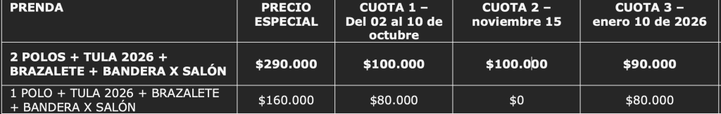 2) Que todos los estudiantes diligencien el formulario de tallas y nicknames. 3) Abono inicial de tos los interesados. Cantidad mínima 60 unidades. tiempo de fabricación máximo 60 días hábiles.