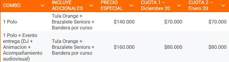 2) Que todos los estudiantes diligencien el formulario de tallas y nicknames. 3) Abono inicial de todos los interesados. Cantidad mínima 50 unidades. Tiempo de fabricación máximo 60 días hábiles.